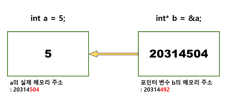 int a = 5;다음과 같이 a라는 변수가 초기화 되었다고 가정해보겠습니다. 이와 같이 정의하는 방식은 위 코드 다음에 다른 코드를 작성했을 때 단순히 a를 사용해서 5라는 값을 찾을 수 있습니다. 마찬가지로, 포인터 변수를 사용해서도 5라는 값을 찾을 수 있습니다.