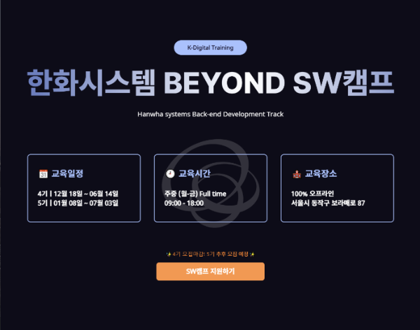 어쩌면 국비지원 학원이 항간에 떠도는 이야기만큼 최악은 아닐 수도 있겠다는 생각이 점점 들기 시작했고, 포트폴리오 준비에 어려움을 겪고 있었기 때문에 프리코스를 지원한 지 얼마 되지 않은 시점에 '한화 시스템 BEYOND SW CAMP'도 함께 지원했다. 그리고 11월 14일부터 3기 수업을 시작했다.