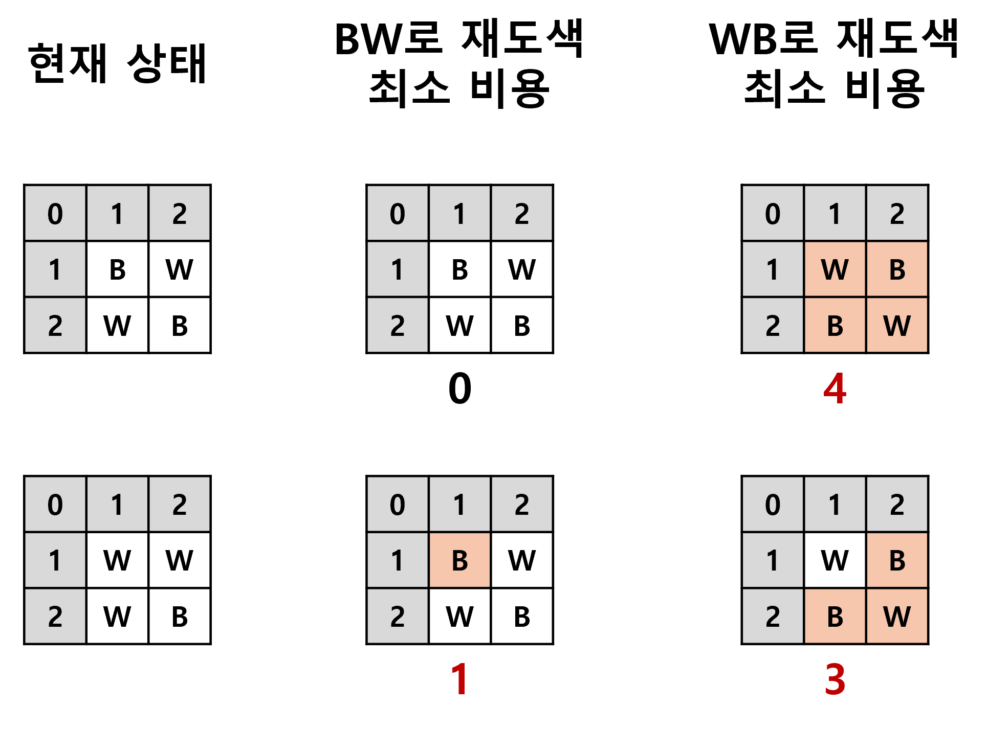 반면, 체스판의 첫 행이 White와 Black으로 시작하는 체스판으로 만들기 위해서는 총 3개의 칸을 다시 칠하면 된다.